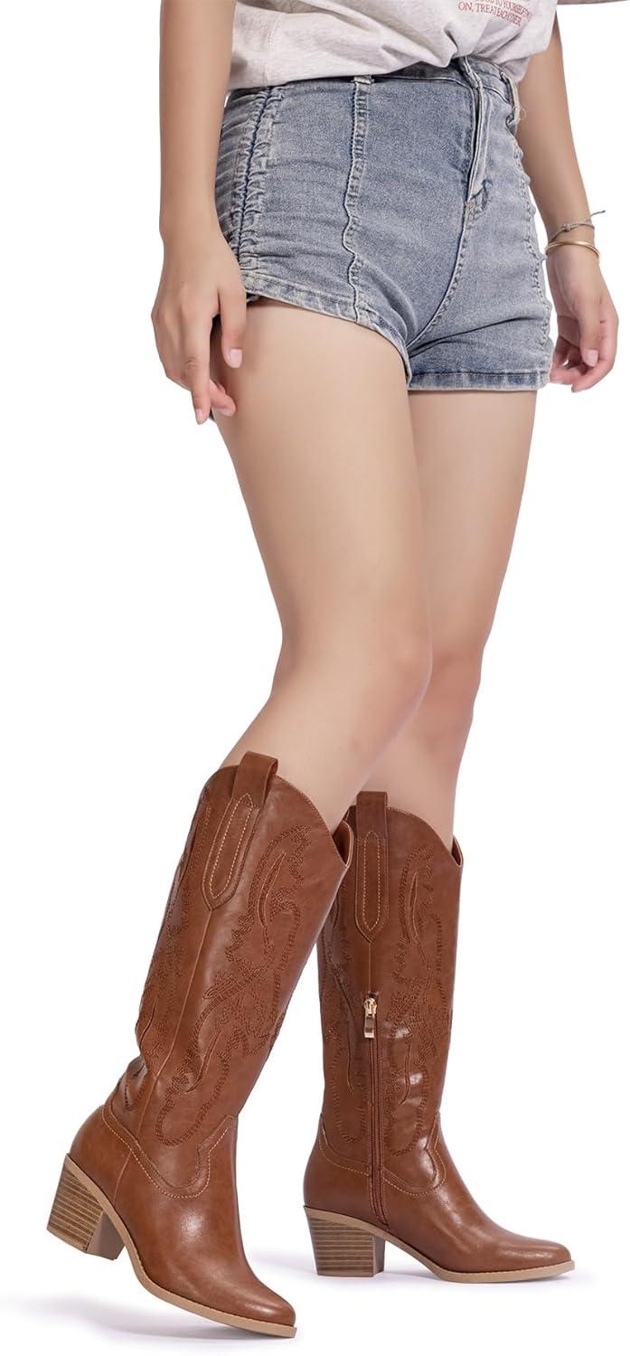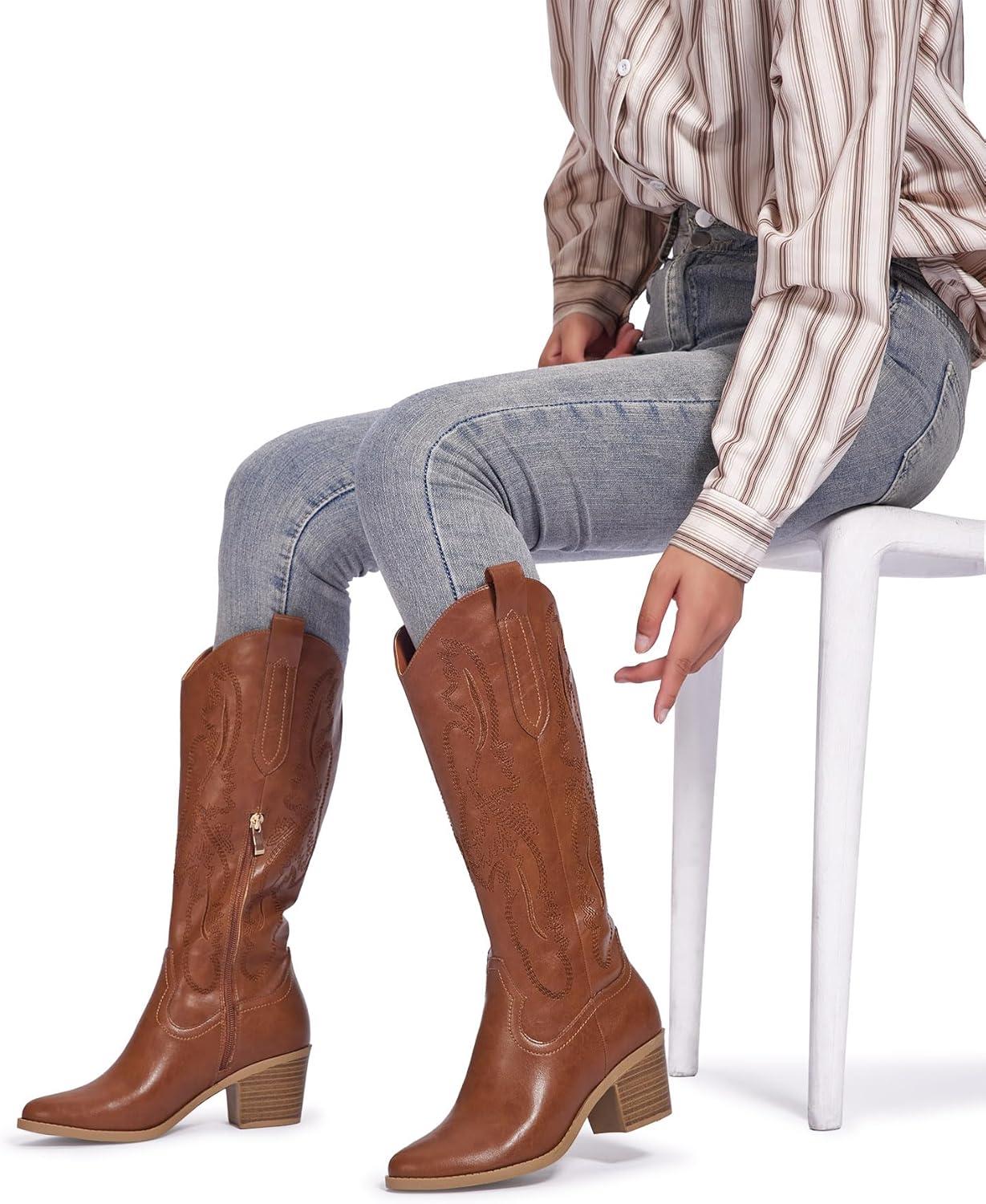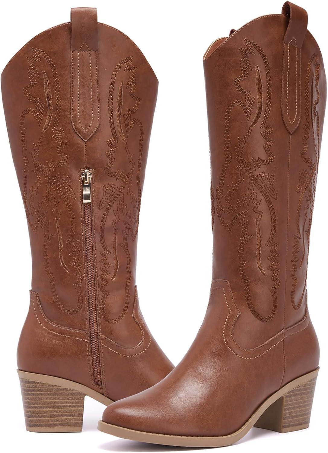 Women’s Cowboy Boots Knee High with Side Zipper Wide Calf Cowgirl Boots Comfortable Western Classic Embroidered Pointy Toe Fashion Retro Classic Pull On Tall Boot Fall Winter(Brown)