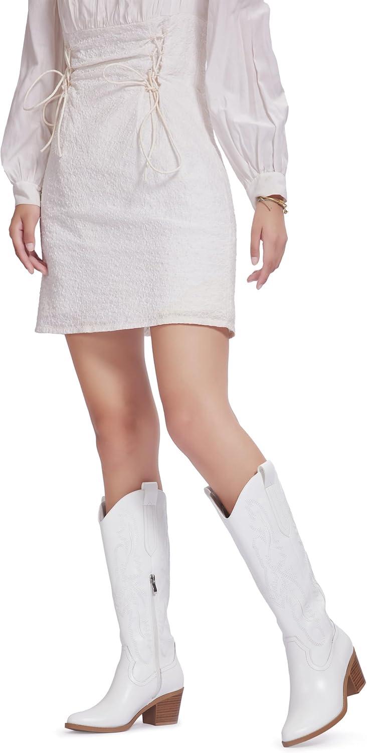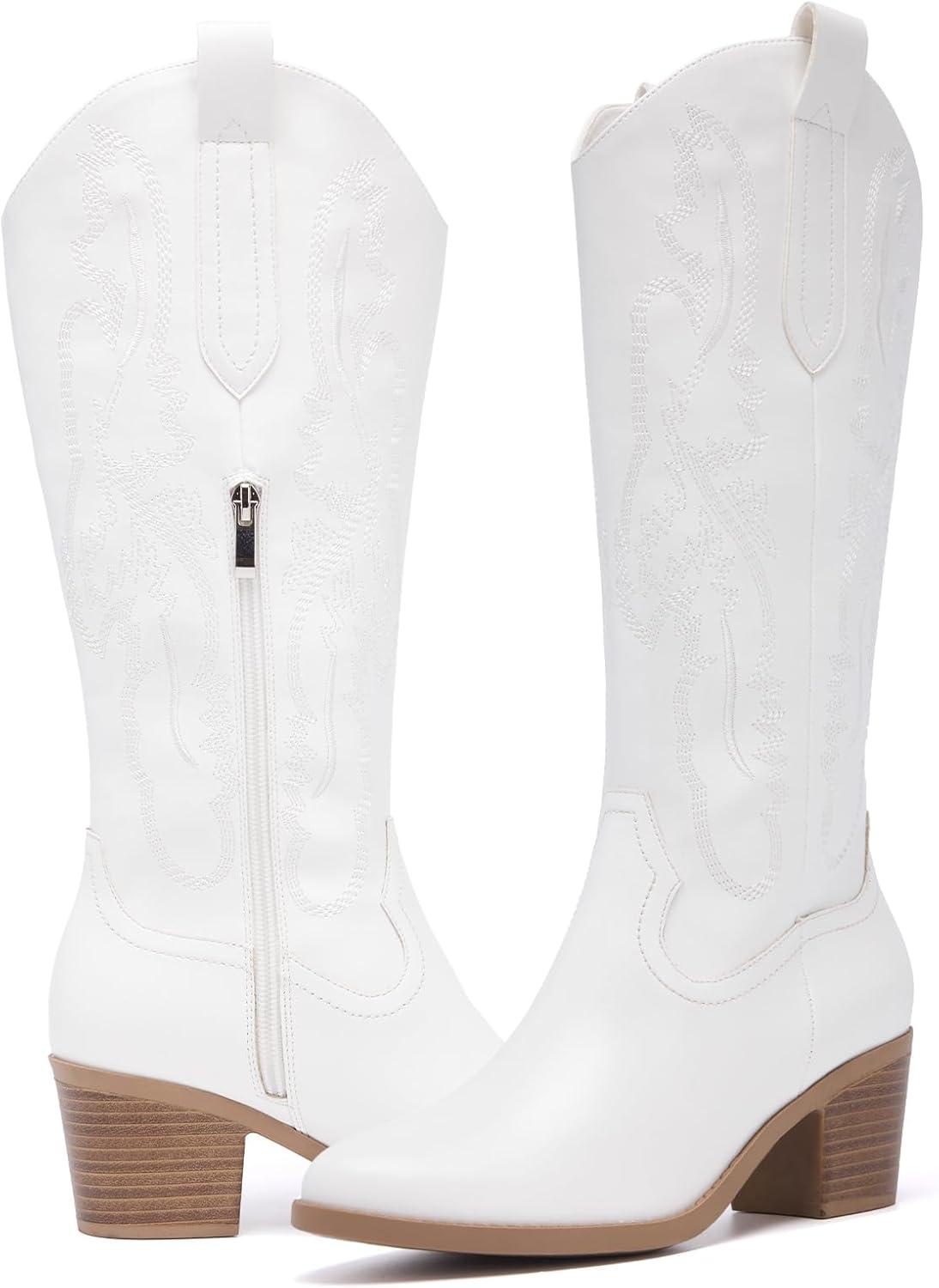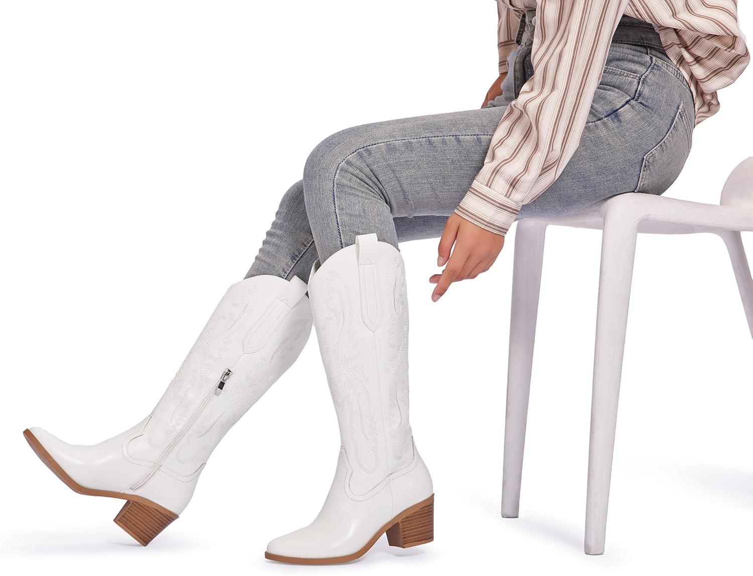 Women’s Cowboy Boots Knee High with Side Zipper Wide Calf Cowgirl Boots Comfortable Western Classic Embroidered Pointy Toe Fashion Retro Classic Pull On Tall Boot Fall Winter(White)