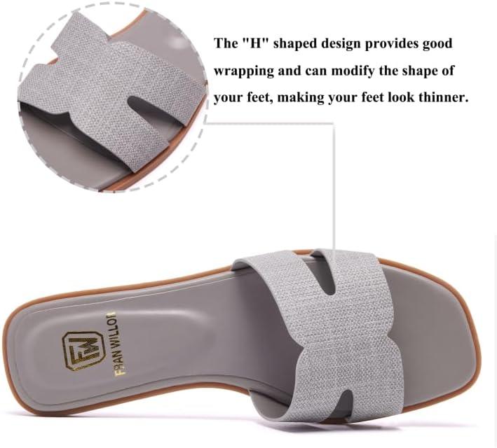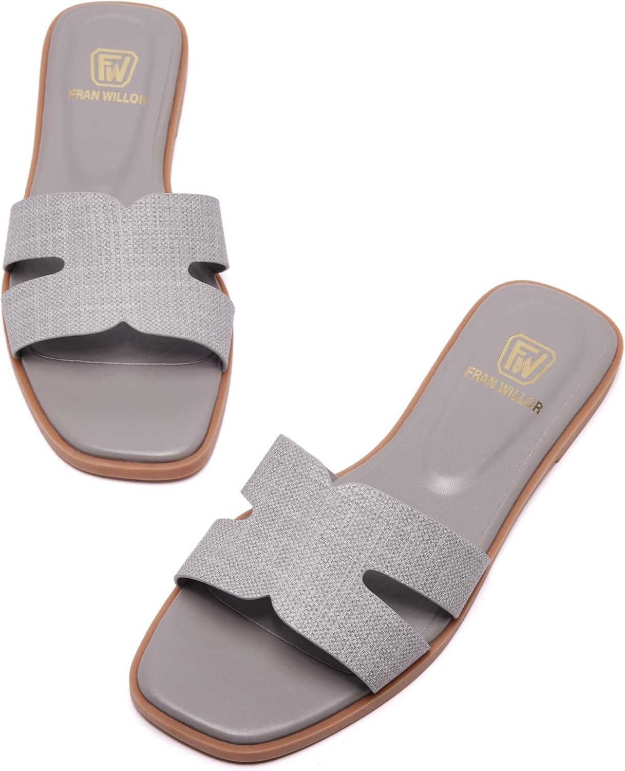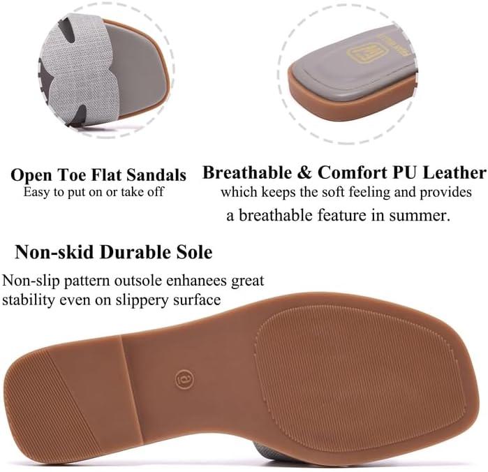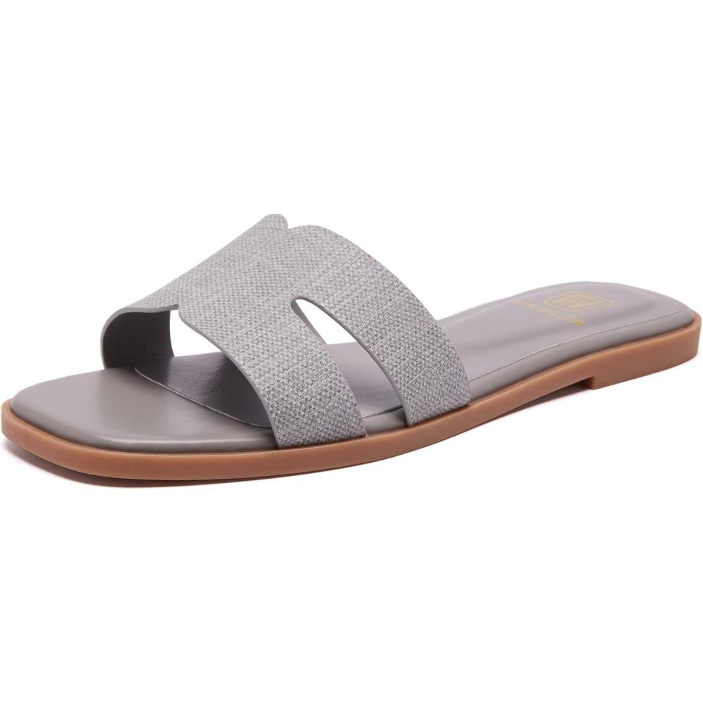 Women’s Flat Sandals Dressy Comfortable Slide Sandals Fashion Square Open Toe Slip On Beach Sandals for Summer(Grey)