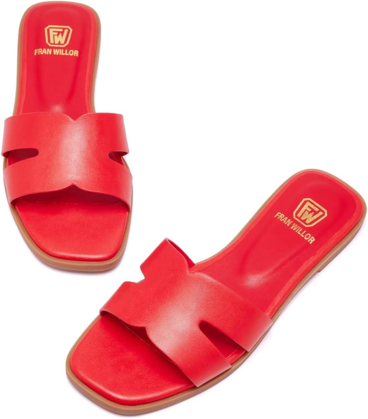Women’s Flat Sandals Dressy Comfortable Slide Sandals Fashion Square Open Toe Slip On Beach Sandals for Summer(Red)