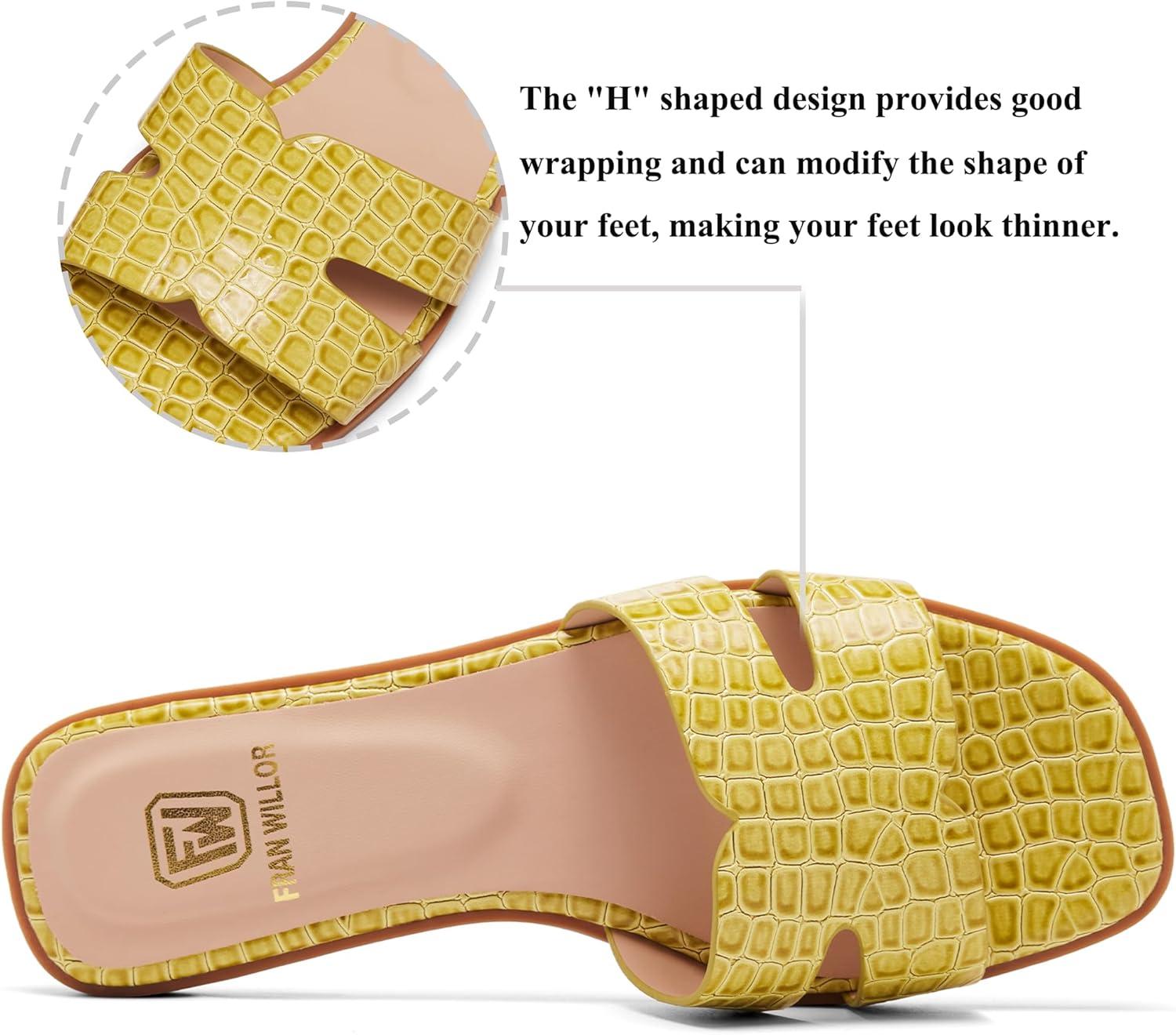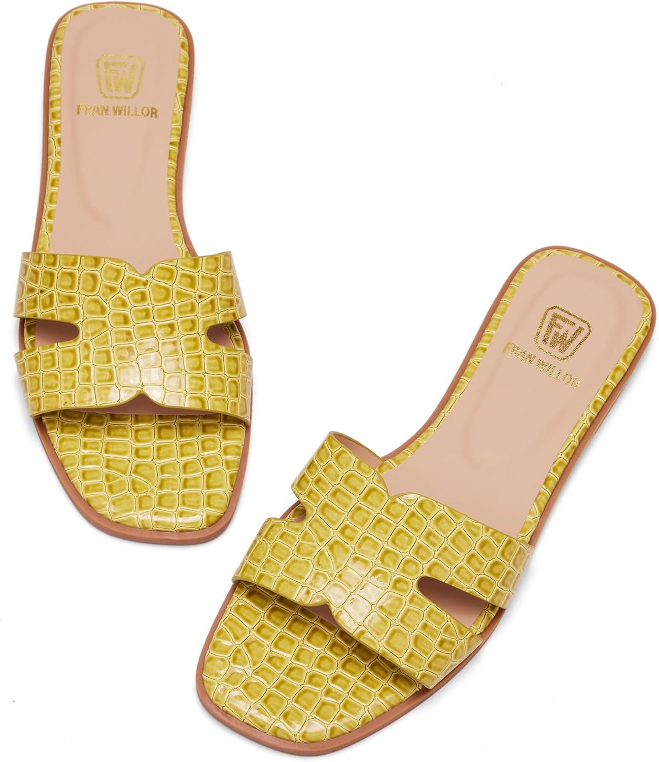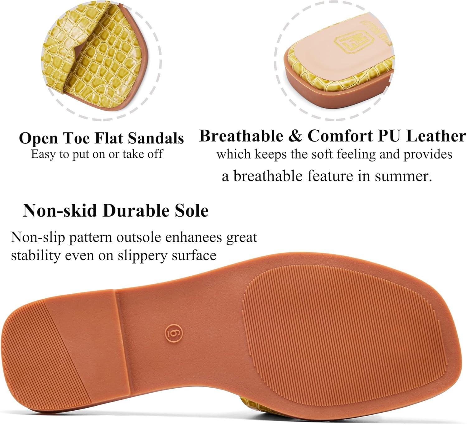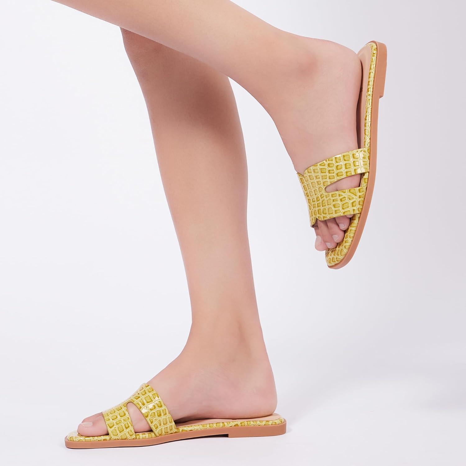Women’s Flat Sandals Dressy Comfortable Slide Sandals Fashion Square Open Toe Slip On Beach Sandals for Summer(Yellow)
