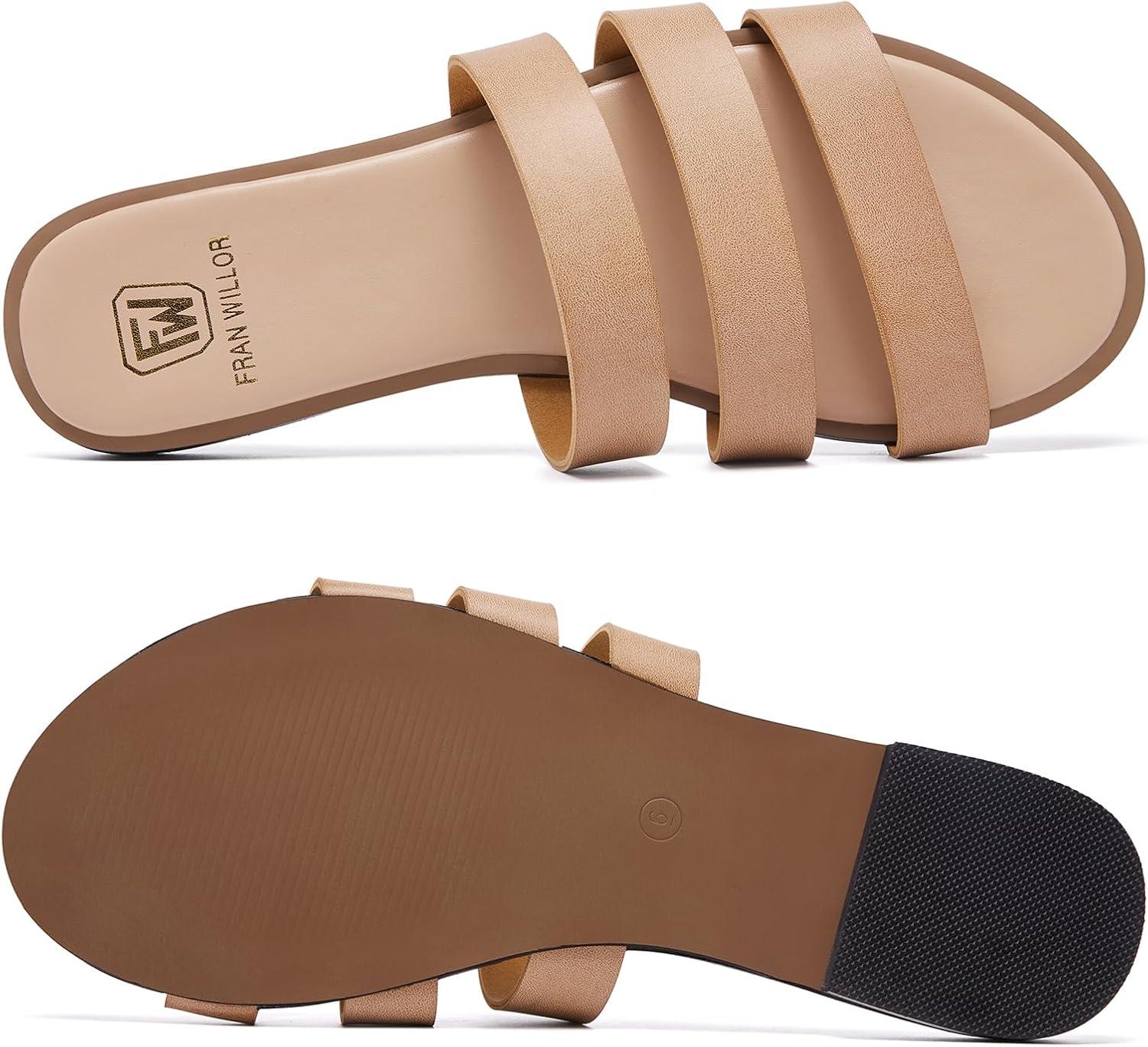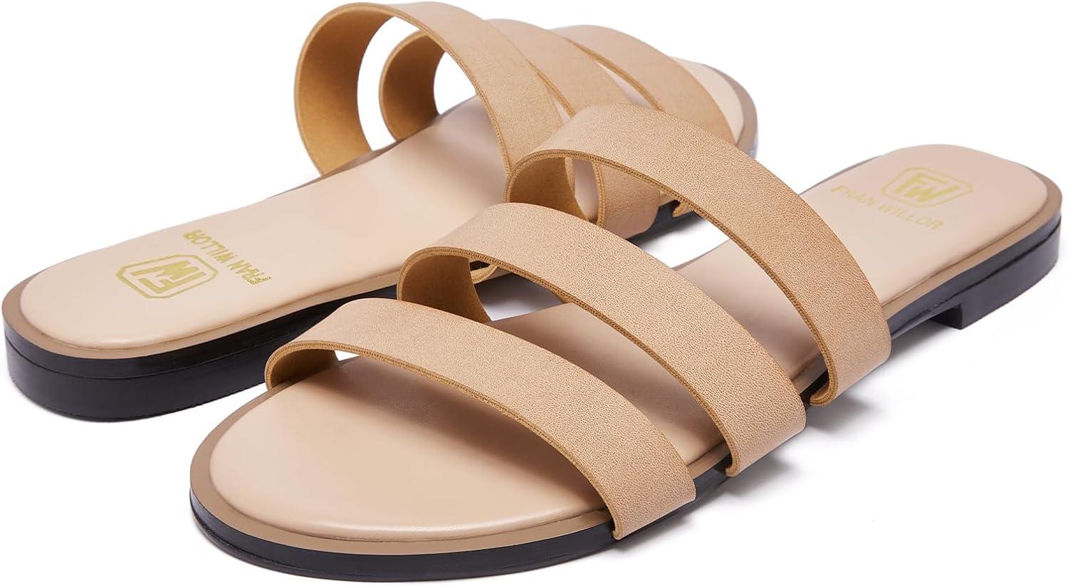 Women’s Flat Sandals Dressy Open Toe Round Toe Slide Sandals Comfortable Casual Beach Slip on Slippers for Summer(Apricot)