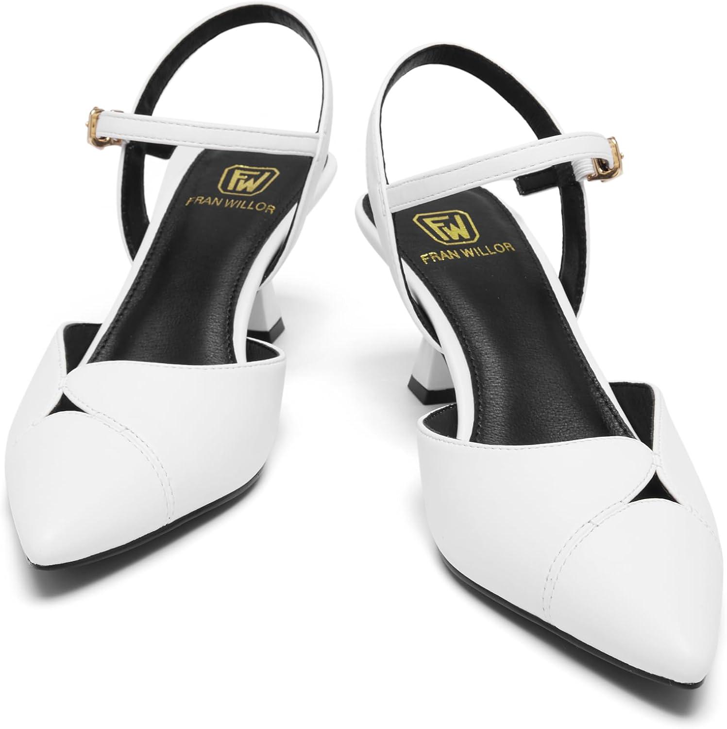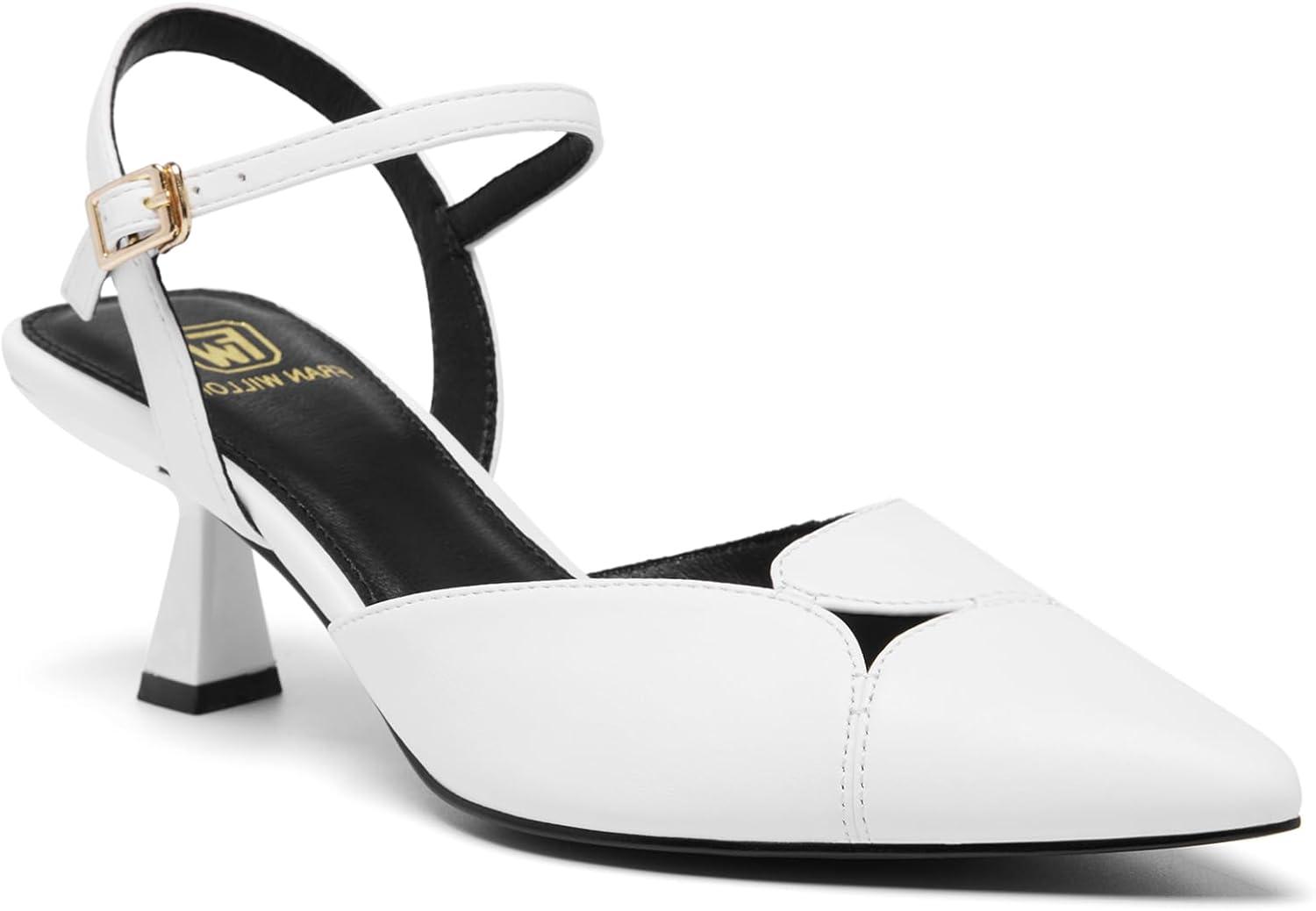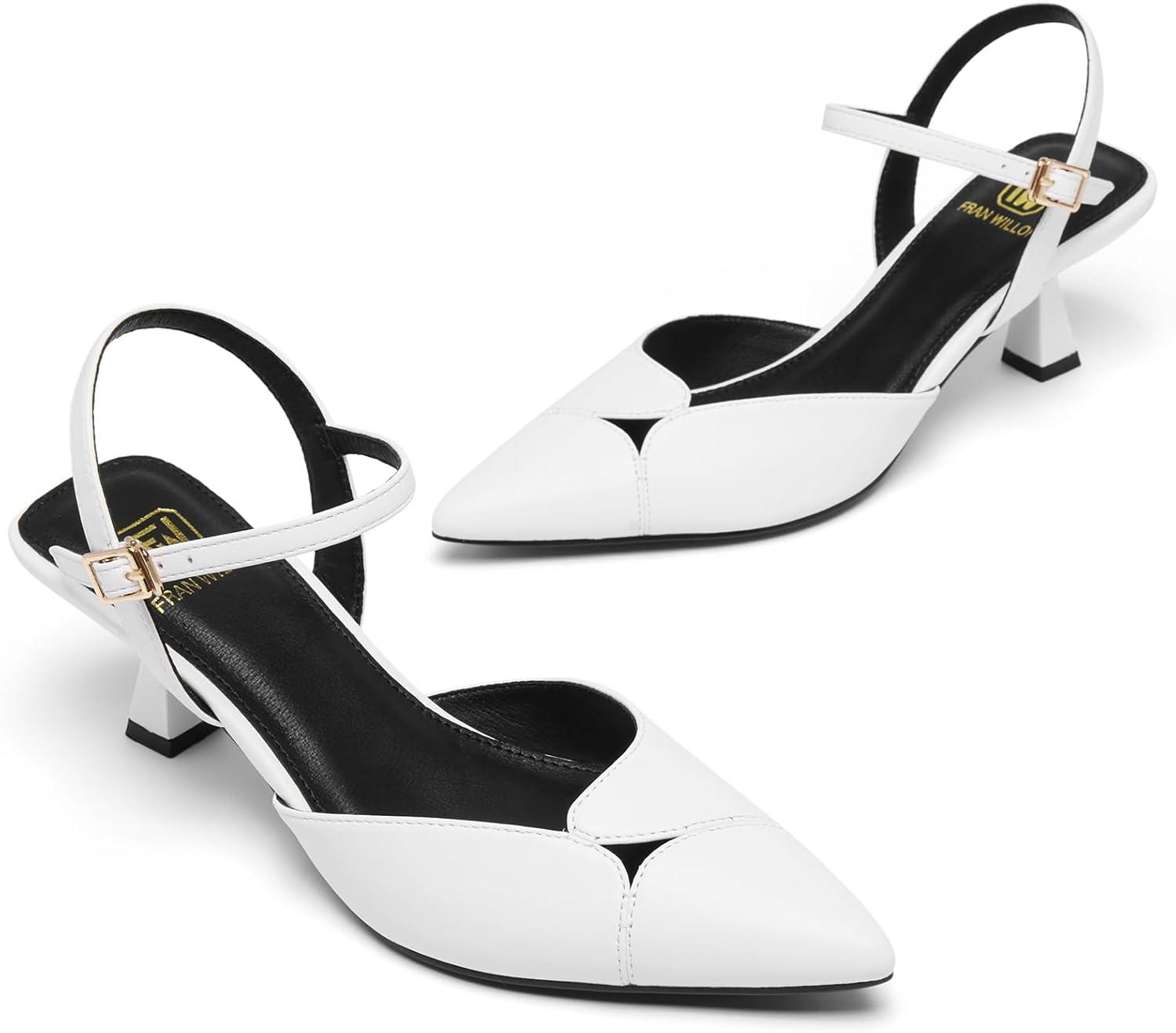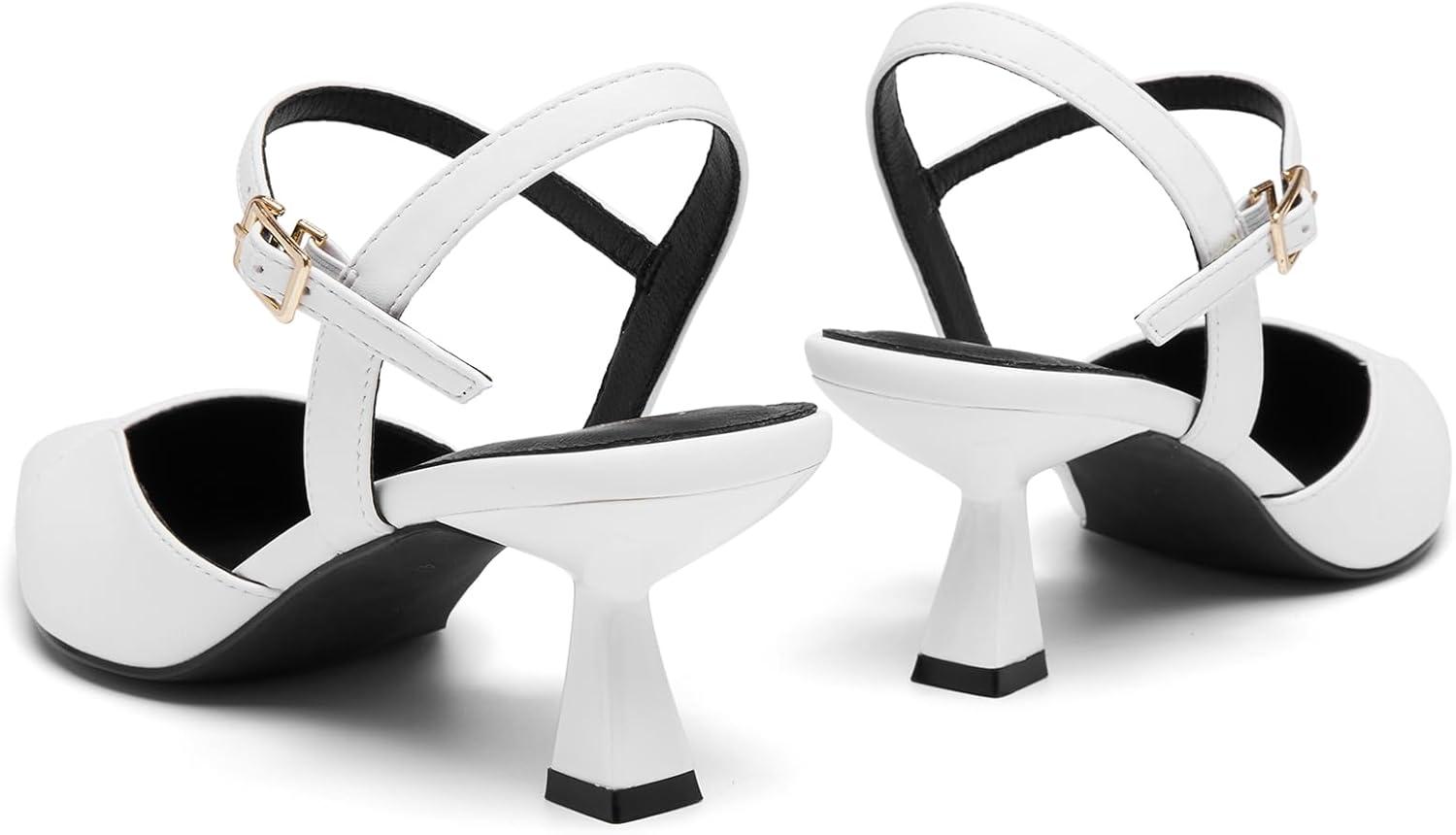 Women’s Slingback Kitten Heels Closed Pointed Toe Pumps Dressy Strappy Ankle Office Low Heel Work Dress Shoes(White)